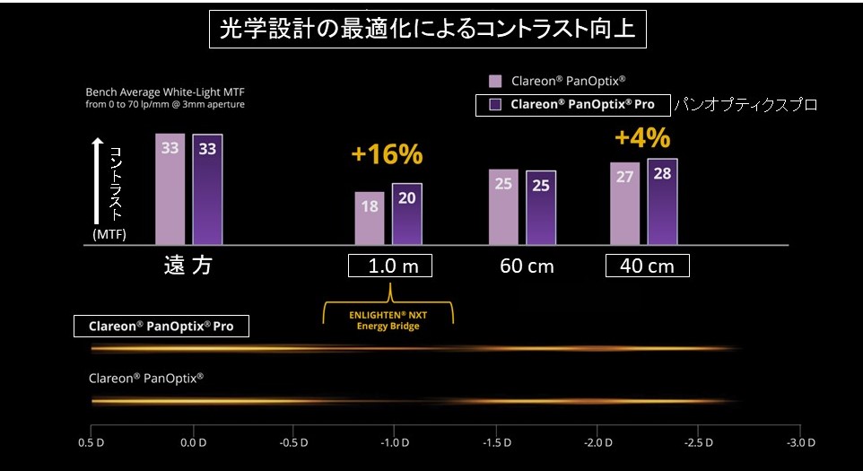 パンオプティクスプロの詳細は随時掲載させていただきますが、光エネルギーの損失を、回折型レンズでは最高レベルの6%(従来は12%)に抑えることで、下図のように全体的なコントラストの底上げ、特に1m前後の中間と40cm付近の上昇を可能とし、いわゆる4焦点レンズに値するスペックを実現しています。